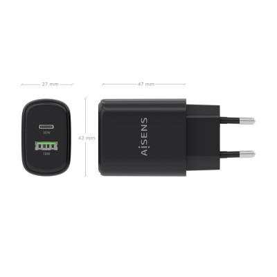 AISENS Cargador GaN 30W, 1xUSB-C PD3.0 QC4.0, 1xUSB-A QC3.0, Negro